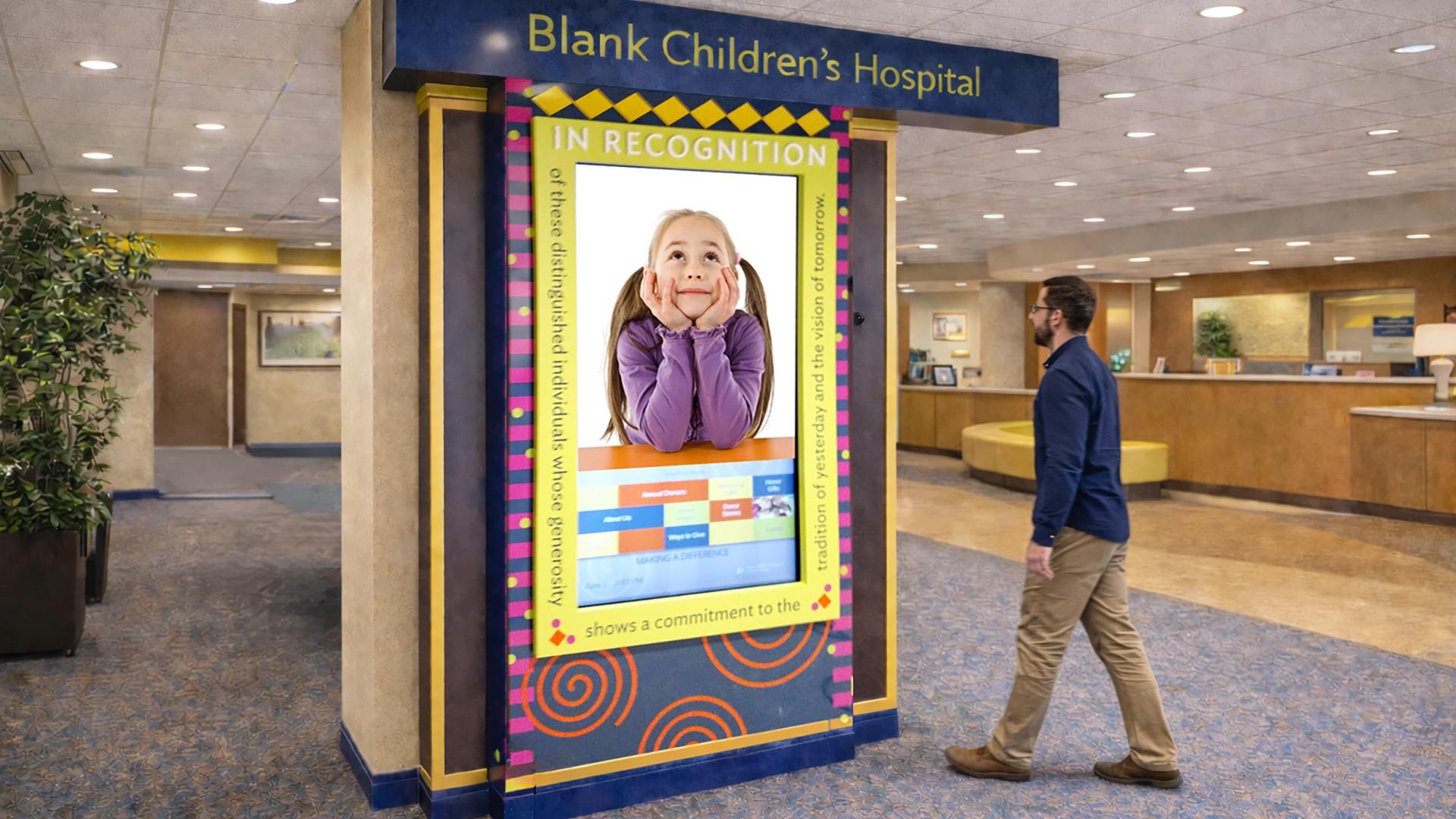 A colorful digital donor recognition wall stands prominently in a modern children’s hospital lobby. The display features a vibrant, child-friendly design with bold patterns and bright accents, surrounding an interactive touchscreen powered by Arreya Digital Signage software service. The screen showcases donor recognition content, including categories and featured supporters, designed for easy navigation and engagement. Above the display, “Blank Children’s Hospital” signage reinforces the setting. A visitor walks past the installation, highlighting its visibility and integration into a welcoming, high-traffic healthcare environment. The overall design blends technology, storytelling, and donor appreciation in a way that aligns with pediatric care spaces.