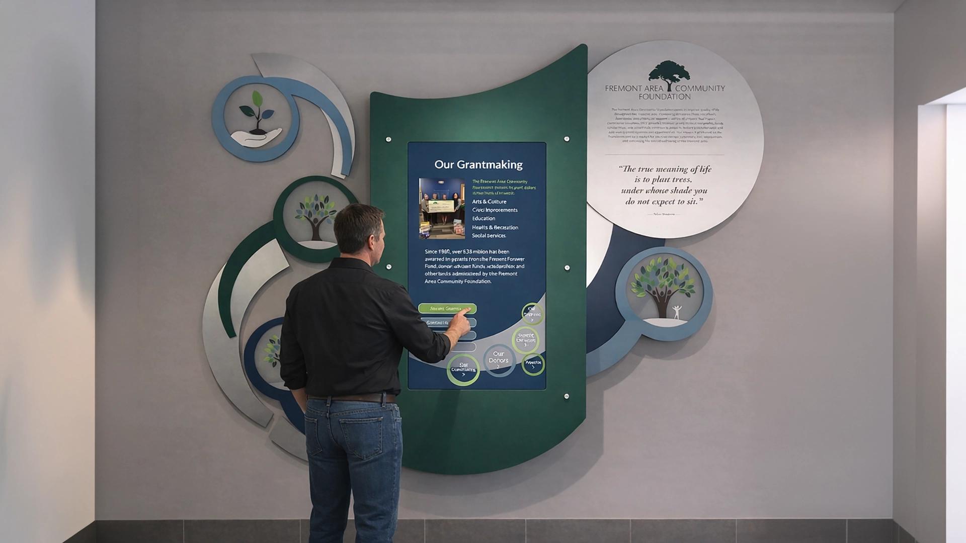 Fremont Area Community Foundation digital donor wall with touchscreen interactive and custom surround.