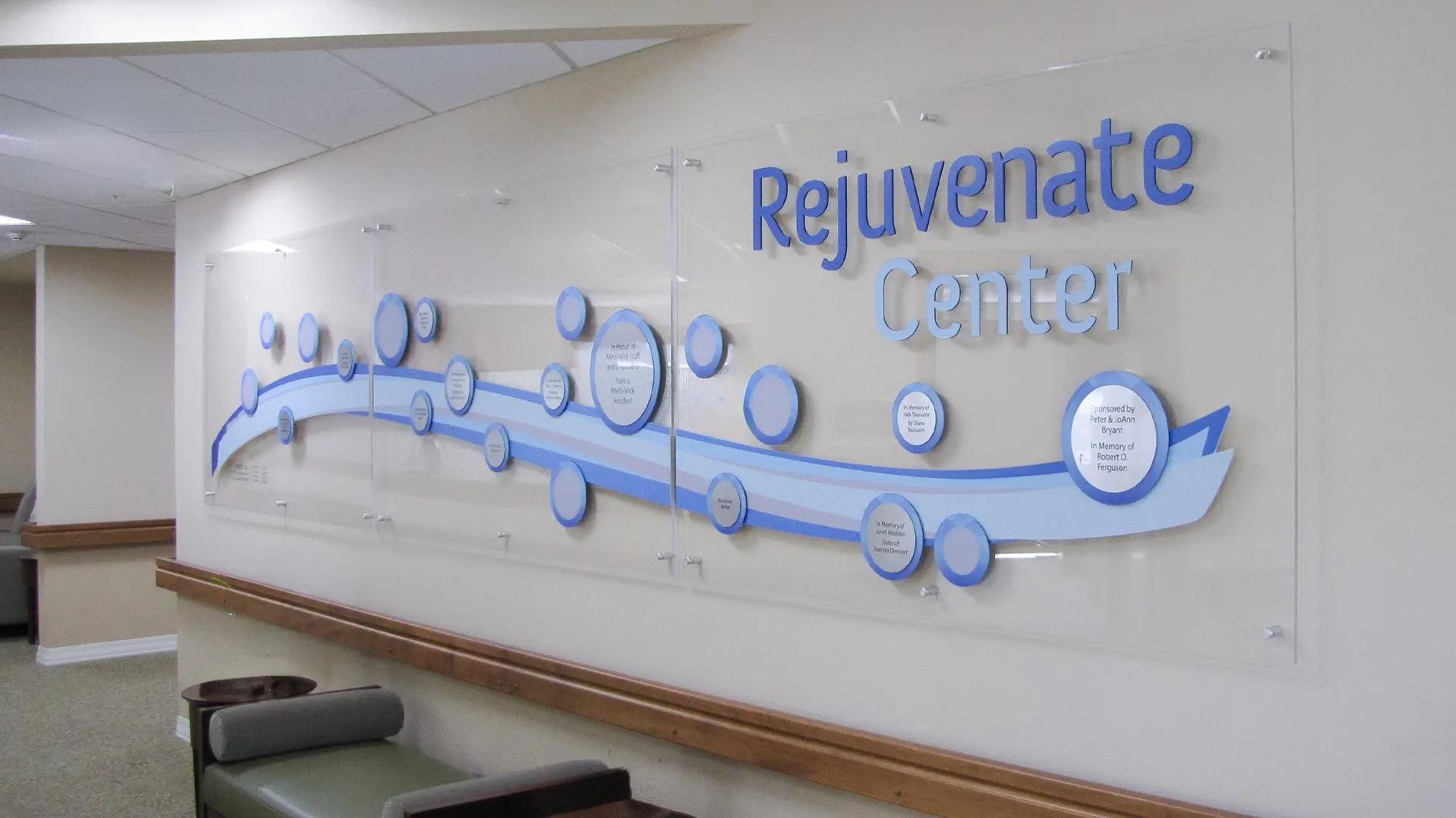 Dimensional lettering identifies the Rejuvenate Center, anchoring the donor wall within the broader facility and visually connecting it to the Aquatic Center. Designed to balance recognition with atmosphere, this donor wall honors generosity while enhancing the restorative, health-focused experience offered at Methwick Retirement Community.